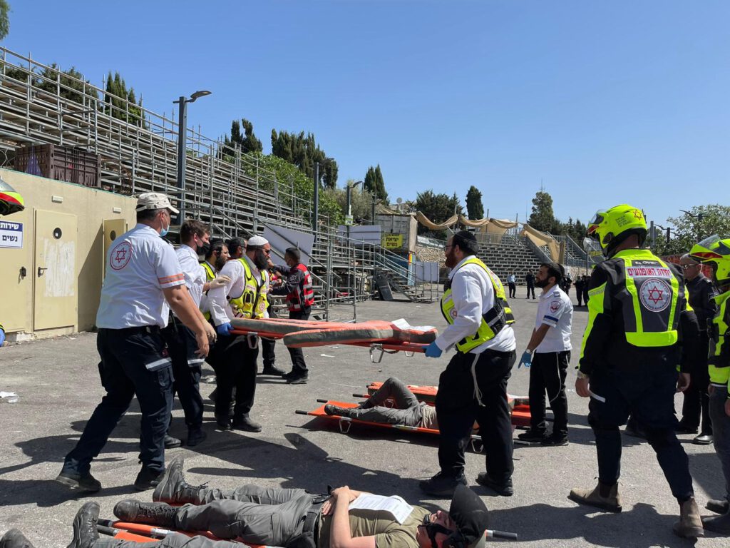כחלק מההערכות לאבטחה הגדולה, נערך הבוקר (חמישי) בהובלת משטרת ישראל ובשיתוף מגן דוד אדום, מכבי אש וצה"ל תרגיל אירוע רב נפגעים ברחבת הדלקה. במסגרת התרגיל תורגל תרחשי של קריסת במת קהל ועשרות רבות של חוגגים נפצעו. "צוותי מד"א, אשר נמצאים בהר בכוחות גדולים העניקו טיפול רפואי לפצועים המדומים." הסביר פרמדיק מד"א עומרי הוכמן שהיה מפקד כוחות מד"א בתרגיל והוסיף "במסגרת התרגיל השתמשנו בטכנולוגיות מתקדמות שפותחו במגן דוד אדום ובכלים ייחודיים דוגמת משאית החפ"ק של מד"א, האוטובוס לטיפול נמרץ וטרקטורונים בעלי התקן מיוחד לחילוץ פצועים. אמבולנסים של מד"א פינו פצועים למנחת מסוקים סמוך על מנת לתרגל חבירה למסוק הצפוני של מד"א שנמצא גם כן בכוננות גבוהה."