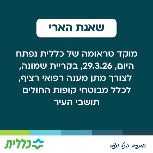 על רקע המציאות הביטחונית המורכבת בקריית שמונה, כללית פותחת, בתיאום ובשיתוף עם משרד הבריאות, מהיום, יום א׳ (29.3.26), מוקד טראומה בעיר, אשר ישרת את כלל מבוטחי קופות החולים.